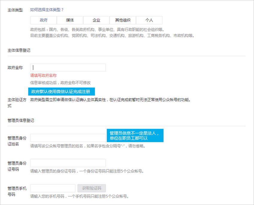 4、信息登记,政府单位请记得选择政府->政府(事业单位也选择政府类型注册);