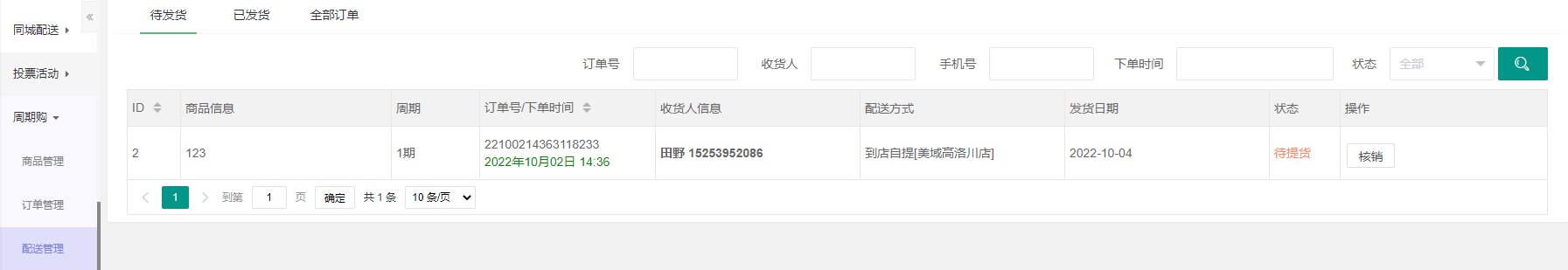 配送管理:可以对订单进行筛选(待发货,已发货,全部订单),通过订单号、收货人、手机号、下单时间、状态进行检索,展示周期购订单信息