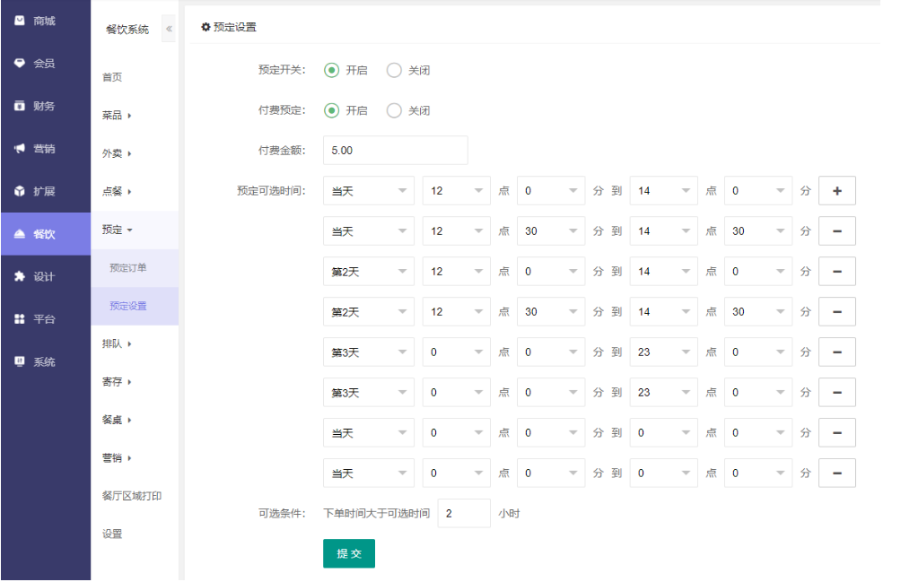 设置预定开启关闭、付费预定开启关闭、付费金额、预定可选时间、可选条件:下单时间大于可选时间几小时