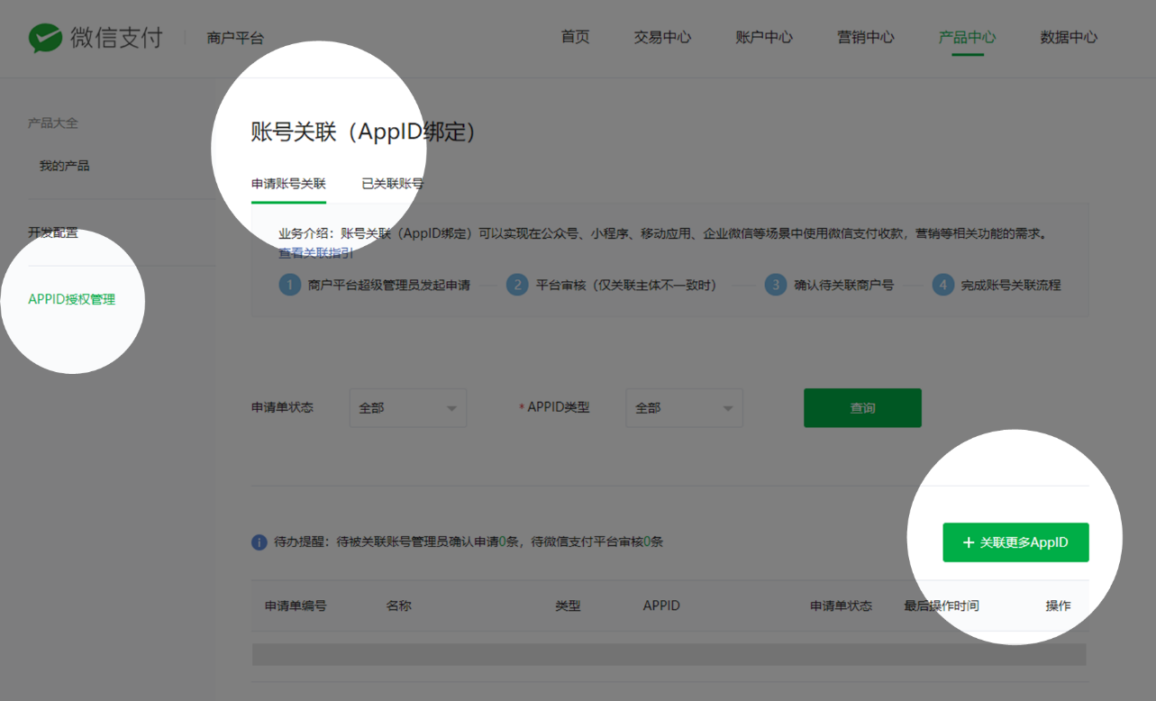 1. 登录商户平台-产品中心-账号关联(AppID绑定),进入授权申请页面;