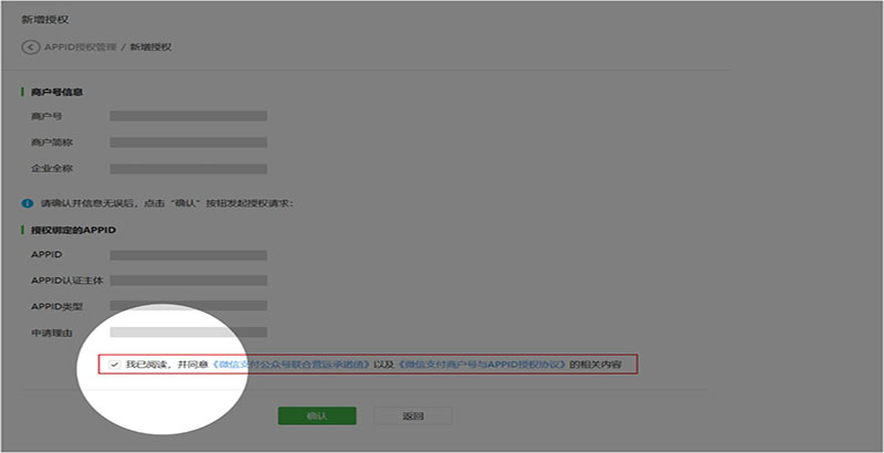 2. 填写相关已认证APPID信息,阅读并签署《微信支付商户号与APPID授权协议》,点击“确认”提交,发起授权申请;