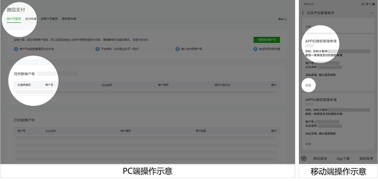 小程序:前往公众平台(mp.weixin.qq.com),点击“微信支付-商户号管理”,查看相关商户号信息,确认授权申请;或在“公众平台安全助手”下发的模板消息中确认授权信息;